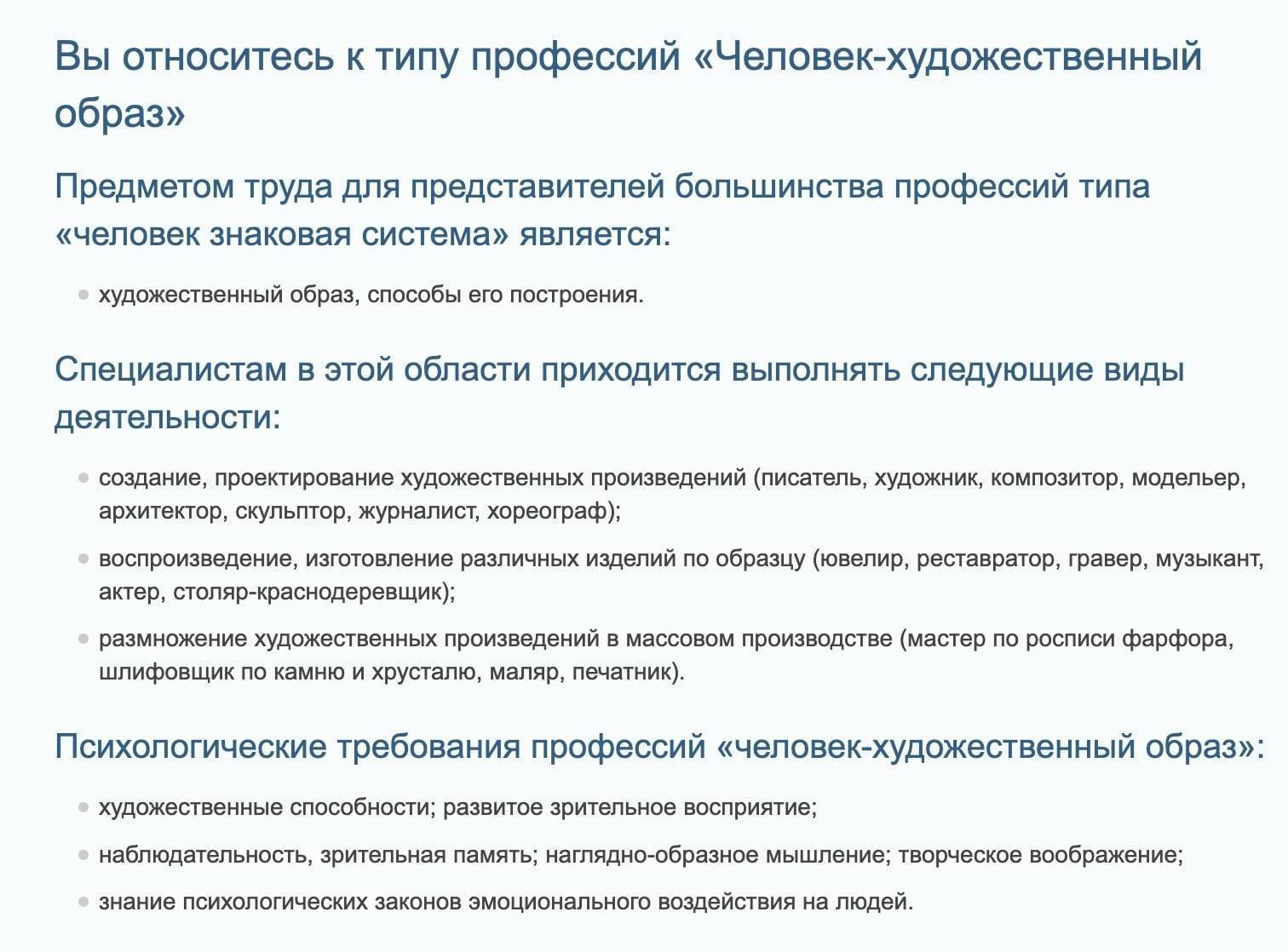 В описании результатов обозначены виды деятельности и психологические требования к профессиям.