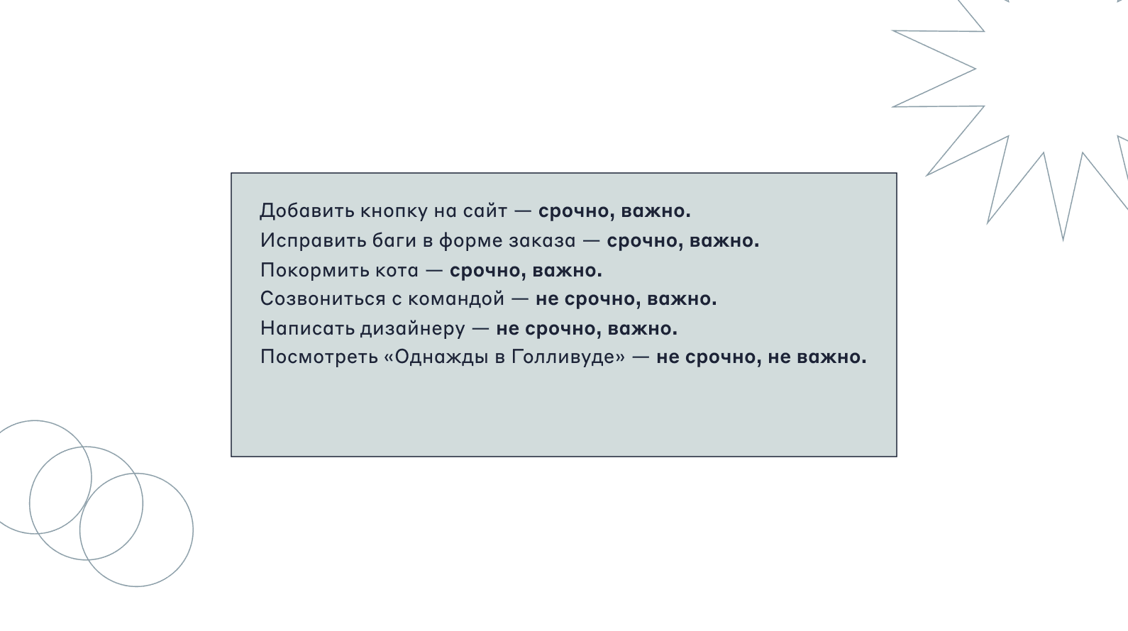 Чтобы планировать дела, не обязательно придерживаться какой-то сложной системы. Попробуйте просто разделять задачи на «срочные» и «несрочные» — такая сортировка поможет понять, за что браться первым делом.