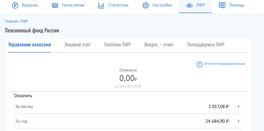 Также в приложении можно управлять взносами в ПФР. Есть специальный раздел, где можно сделать оплату за месяц или за весь год.