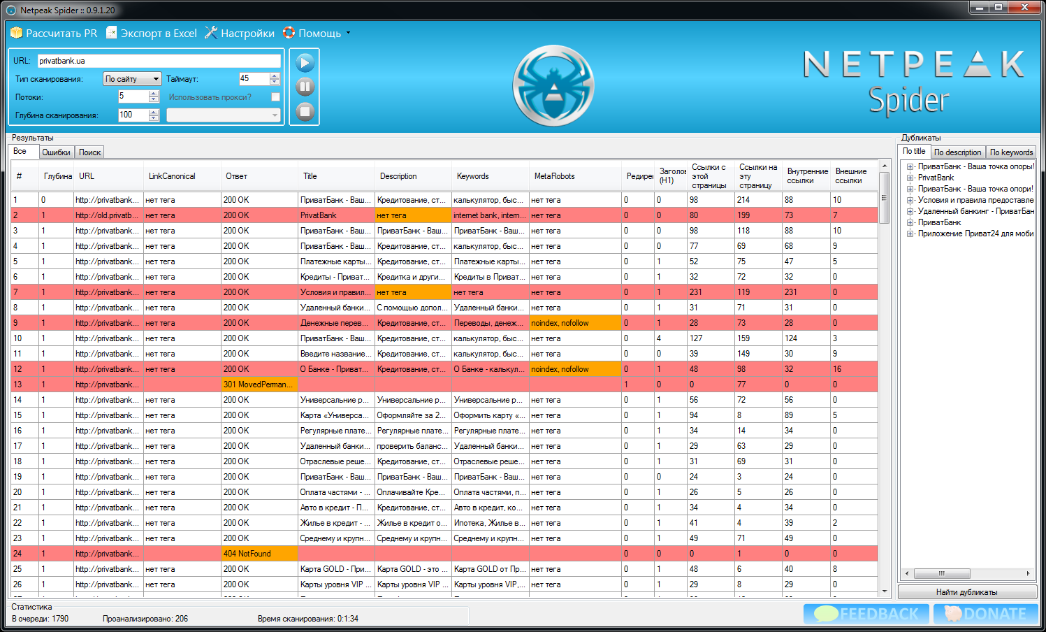 Netpeak Spider анализирует сайт досконально. Программа может обнаружить на сайте более 80 распространенных ошибок внутренней оптимизации, пагубно влияющих на позиции ресурса в поисковой выдаче.