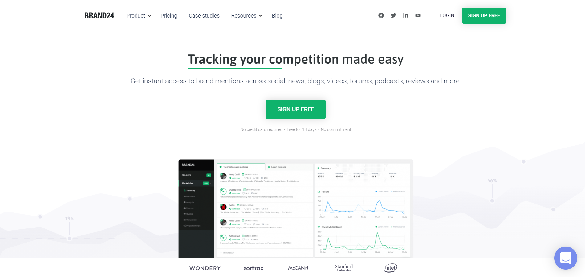 Brand24 – англоязычный сервис, пользующийся популярностью у 30 000 различных организаций по всему миру: он сотрудничает с такими брендами, как Panasonic, IKEA, H&M, Raiffeisen Bank. Он предоставляет данные из более чем 20 социальных сетей, новостных порталов, блогов и других интернет-площадок. С его помощью можно найти упоминания о конкурентах в указанных источниках и определить отношение клиентов к компании.