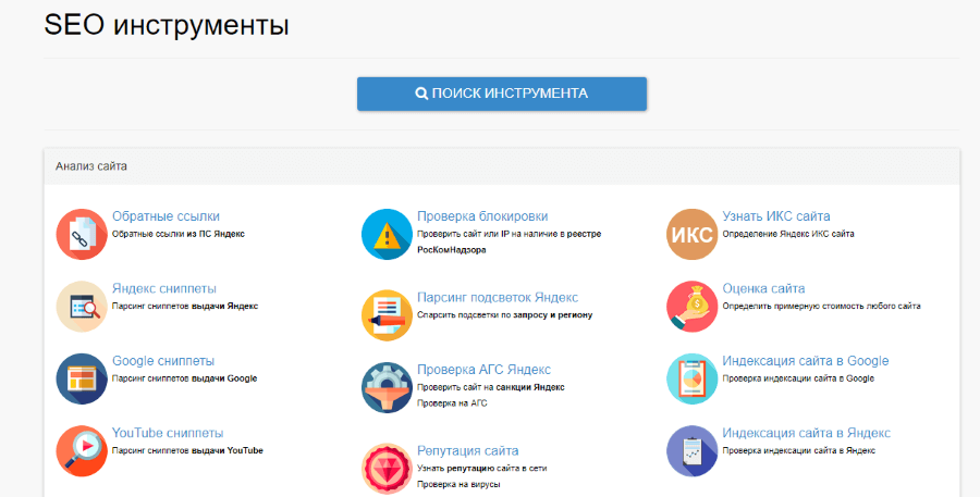 В SeoLik больше 100 разнонаправленных инструментов. Например, можно определить возраст домена или аффилированность сайтов, проанализировать ссылки из соцсетей, проверить, нет ли страниц в реестре запрещенных ресурсов РКН.