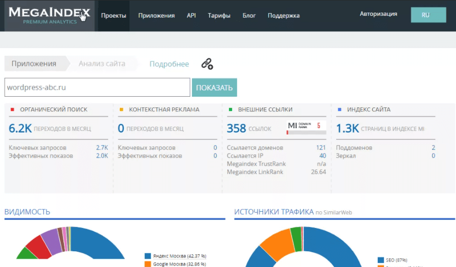 - Анализ видимости сайта в поисковых системах. Оценивает трафик, количество поисковых запросов в ТОП Яндекс и Google, показывает запросы и позиции по ним (в бесплатной версии до 5-й строки, в платной – все запросы).