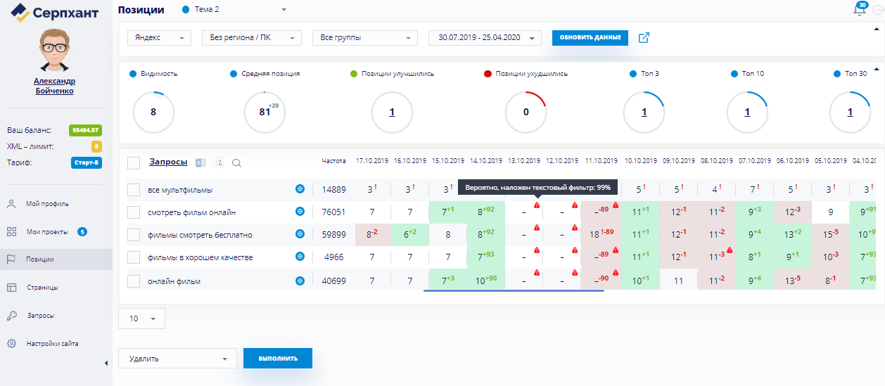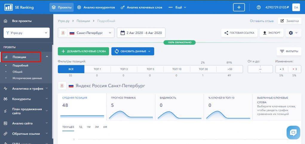 Проверка позиций доступна на тарифах «Начальный», «Профи» и «Агентство» и включена в стоимость тарифа. Вам не нужно отдельно платить за проверки каждого ключевого слова.