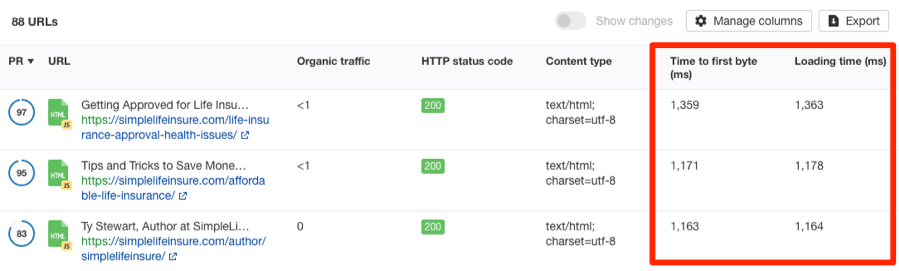 После этого вы увидите Время до первого байта (мс) (Time to first byte (ms)) и Скорость загрузки (мс) (Loading time (ms)).
