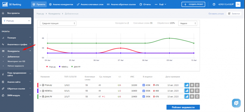 Возможность прошерстить конкурентов в тематике. В Se Ranking это делается через соответствующий раздел.