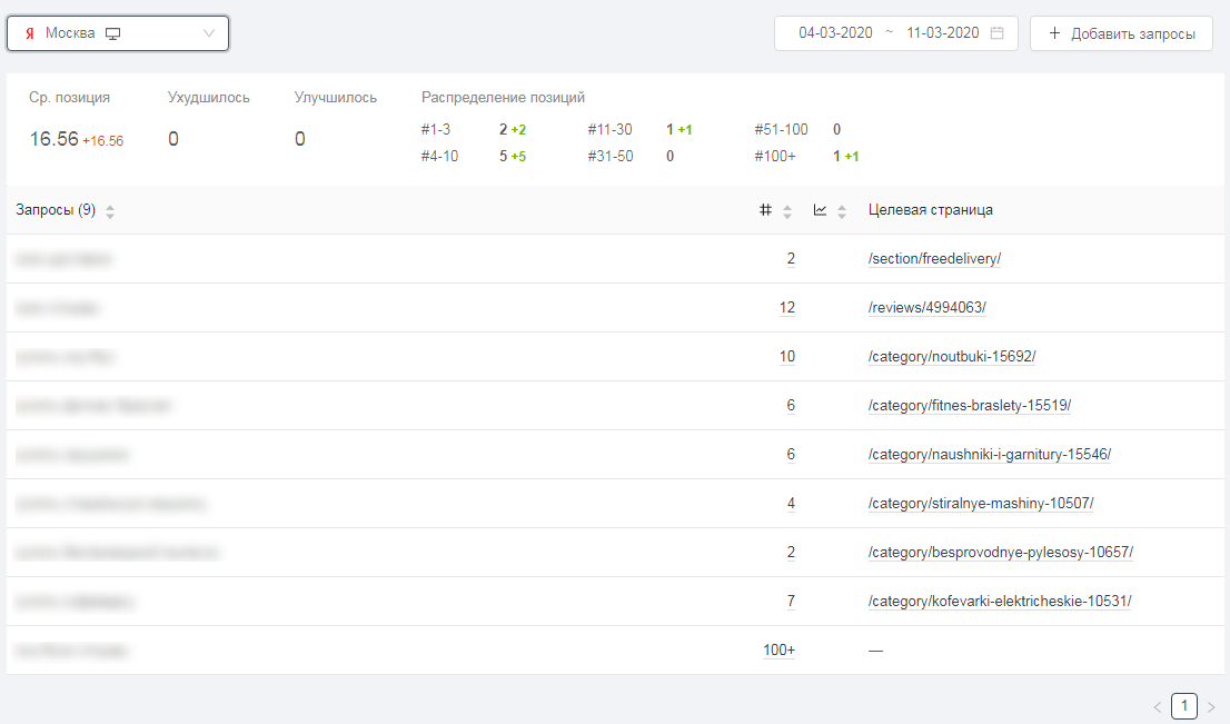 В отчете Позиции вы увидите запрос, позицию сайта по нему и целевую страницу в зависимости от выбранной поисковой системы и региона. Вверху отображается динамика, чтобы вы представляли, растут позиции или падают.