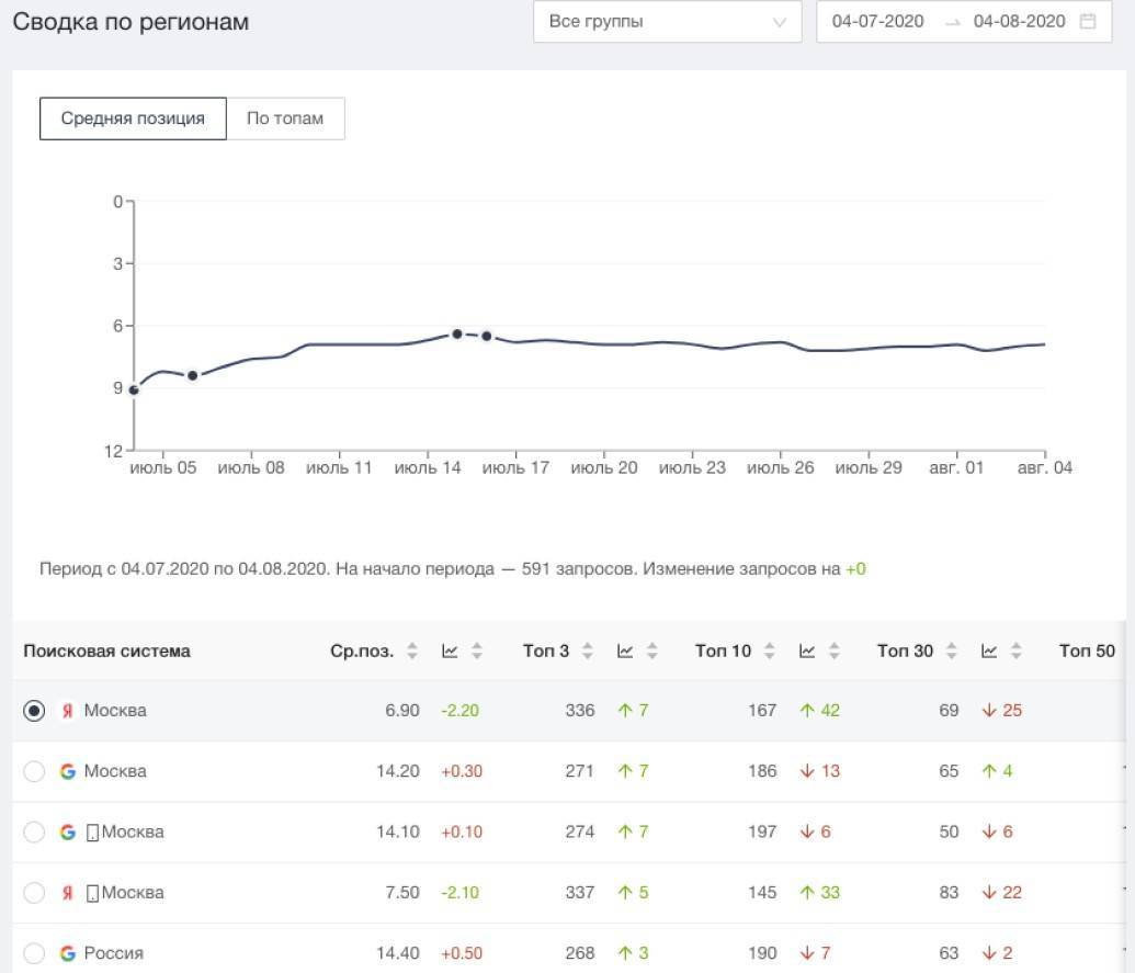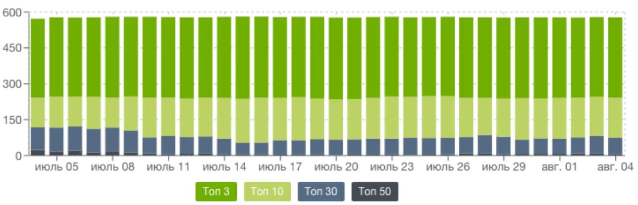 Если выбрать данные по топам, сервис покажет количество запросов, попавших в топ-3, 10, 30 и топ-50.