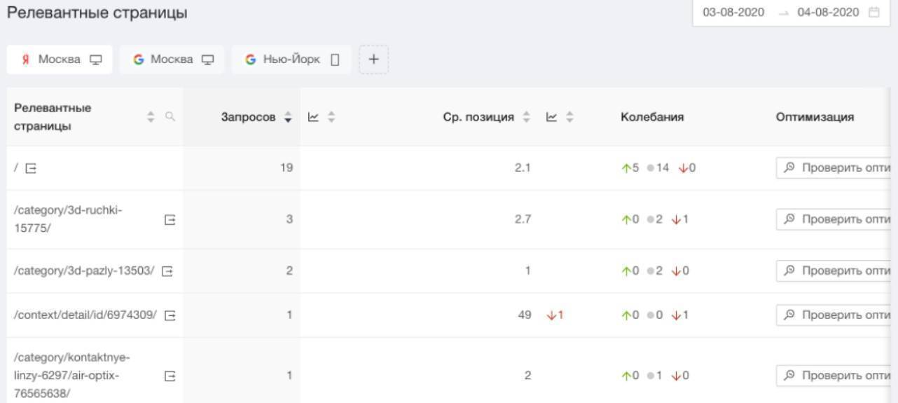 Недавно мы добавили отчет по релевантным страницам, в нем показываем URL по вашим ключевым словам, полученным из выдачи. Удобно смотреть сводку по разделам вашего сайта, если ключи плохо разбиты по группам. Кстати, в этом же отчете в один клик можно проверить уровень оптимизации страницы.
