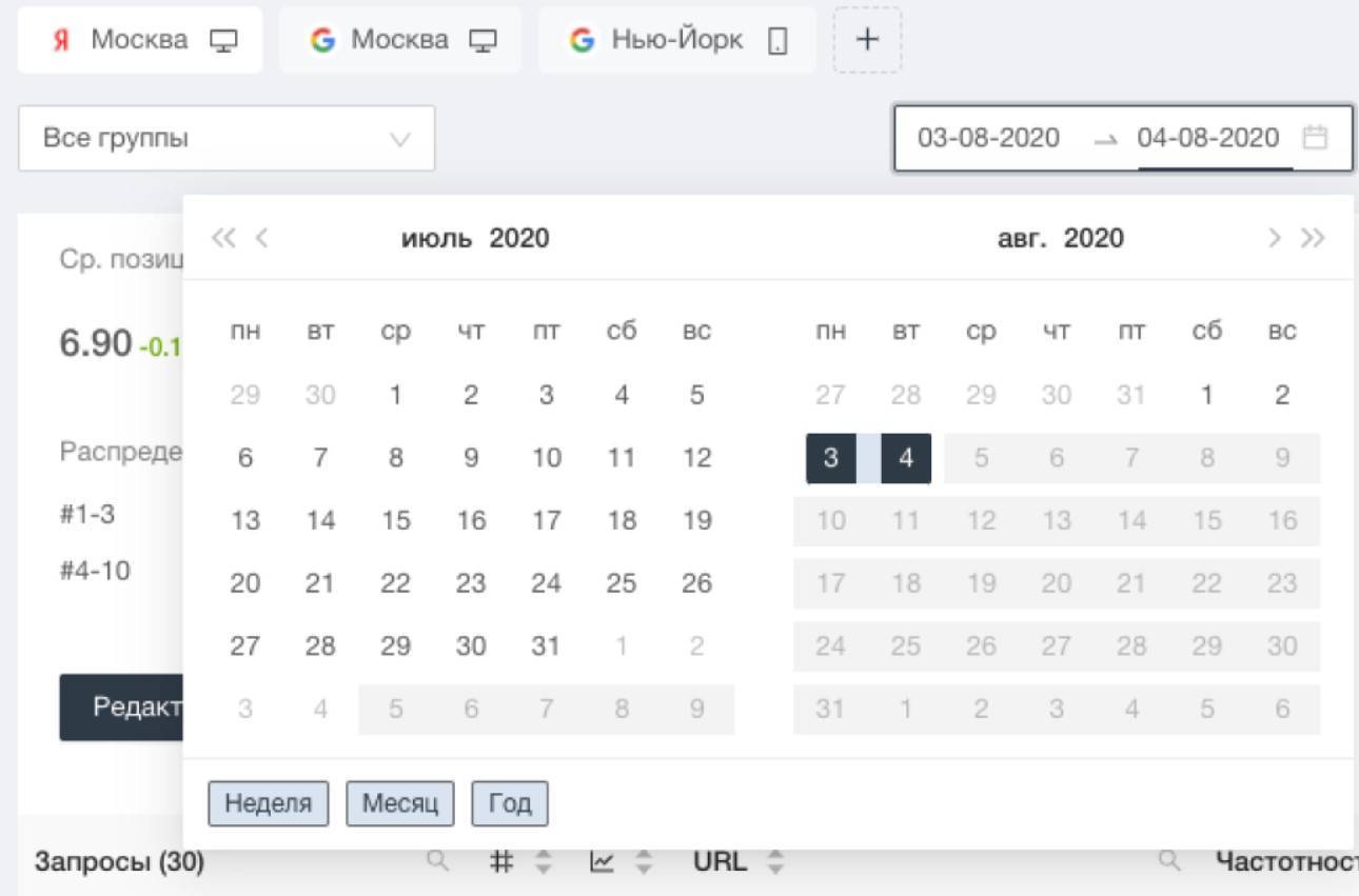 В сводке по регионам видны изменения средней позиции и топов, вы сами устанавливаете интересующий вас временной период. По клику на календарь открывается фильтрация по датам. Вы можете посмотреть сводку по неделе, месяцу или году, а можете выбрать даты сами.