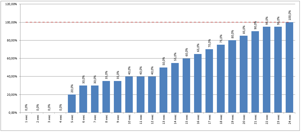 Для расчета плана оказания услуг сделаем расчет максимальной мощности загрузки автомойки. Примерная длительность мойки одного автомобиля на одном посту составляет 1 час. Поэтому, обслуживая двумя постами клиентов автомойка сможет обслужить за месяц максимум 24 х 30 = 720 автомобилей. При средней выручке в 370 руб. максимальная выручка за месяц составит 266 400 руб. При этом планируется, что при выходе на 100% мощность предприятие будет выдавать 70% от ранее расчитанного максимума. Выход на 100% описан в следующем графике:
