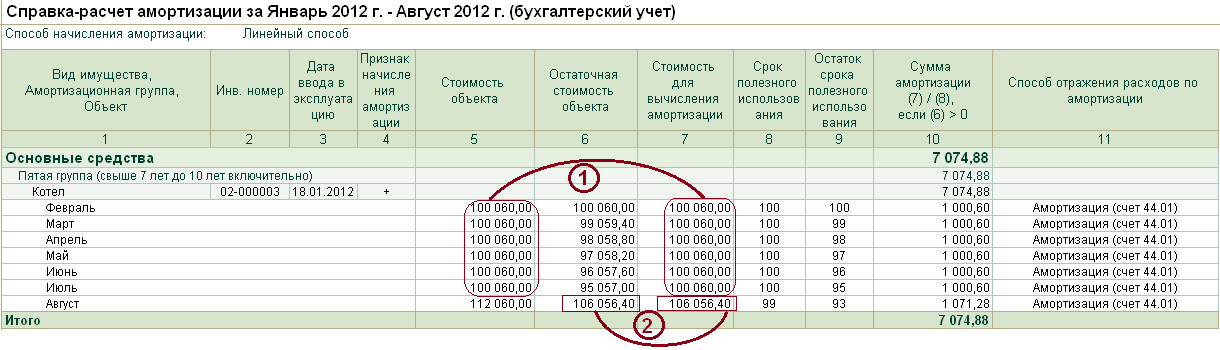 Из таблицы справки видно, что пока основное средство не модернизировалось, его стоимость для начисления амортизации была равна стоимости объекта (маркер 1). А вот после модернизации – по остаточной стоимости объекта (маркер 2).