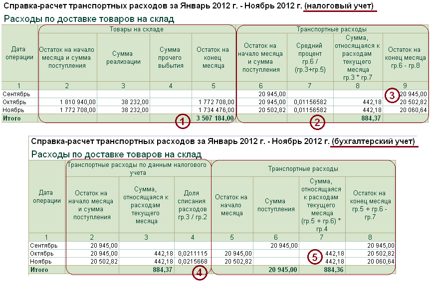 Это вообще особая справка. Она по-разному формируется по данным бухгалтерского и налогового учета. Это связано с тем, что в бухгалтерском и налоговом учете применяются разные методы для расчета транспортных расходов.