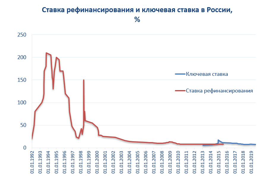 Ставка рефинансирования была введена 1 января 1992 г. Телеграммой ЦБР от 29.12.91 № 216-91 и прекратила действие 13 сентября 2013 г. А ключевая ставка действует с 13 сентября 2013 г. по настоящее время и введена информацией «О системе процентных инструментов денежно-кредитной политики» от 13.09.2013 г.