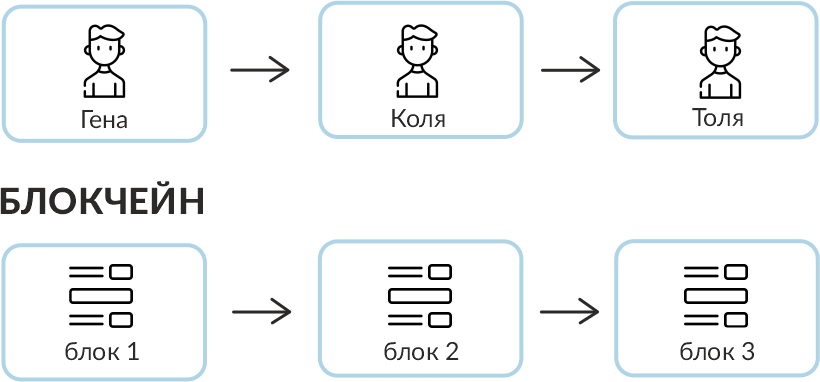 Главный секрет биткоин-транзакций заключается в том, что, когда вы переводите со своего кошелька какое-то количество BTC на чужой кошелек, вы на самом деле физически ничего не переводите. Тут-то в игру и вступает блокчейн. Фактически вы создаете запись в общем реестре о том, что переводите, допустим, 1 BTC на другой кошелек. Эта запись ссылается на прошлую запись в реестре, ту, в результате которой вы эти биткоины получили. И так вплоть до самых первых биткоин-переводов в истории. Вся эта «родословная» денежных переводов и называется блокчейном биткоина, и, кстати, она публично доступна. Звучит немного сложно и запутанно, поэтому разберем на примере: