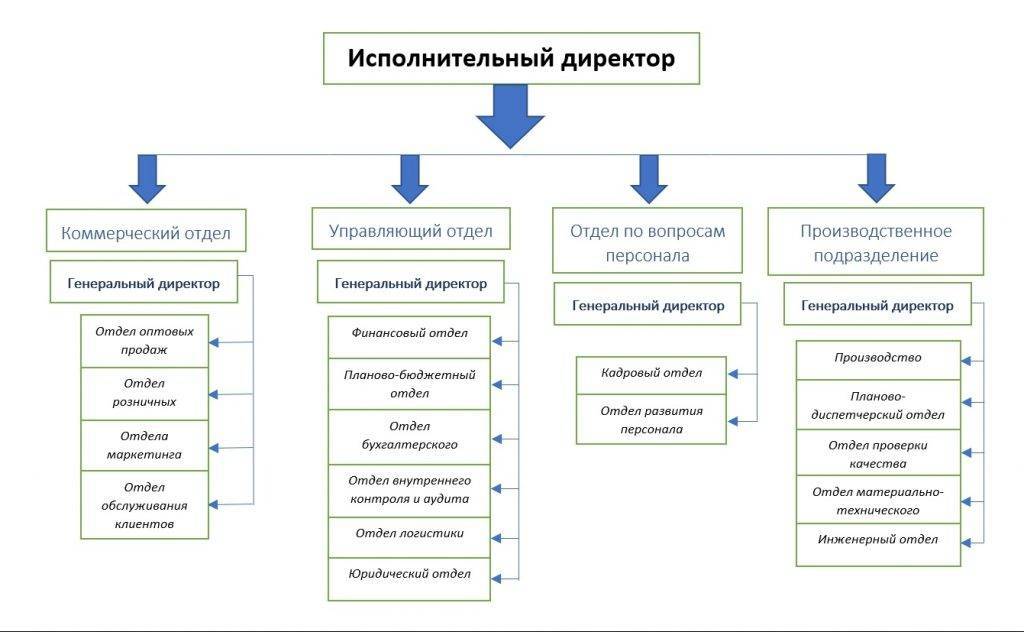 В качестве практического примера разберем структурную организацию вымышленной компании, занимающейся производством и реализацией своей продукции. Ознакомиться со структурой предприятия можете на схеме ниже.