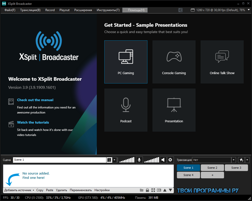 XSplit Broadcaster — это приложение Windows, которое разработано для ведения трансляций на разных площадках. Через него можно стримить не только на YouTube, но и в Zoom, Twitch, Discord, Skype. Возможности, которые предлагает приложение, практически безграничны: можно редактировать видео в режиме реального времени, настраивать порог для хромакея, устанавливать красивые переходы между переключаемыми трансляциями, управлять подавлением шума, прятать источники и бренды, настраивать эффекты, предустанавливать звуковые дорожки и так далее. Приложение активно дорабатывается, в него добавляют все новые и новые плагины. С помощью расширений, которые нужно скачивать отдельно, можно добиться невероятных эффектов. Сама программа позволяет сохранять пользовательские скрипты и макросы, что делает ее необычайно гибкой и настраиваемой для каждого пользователя.