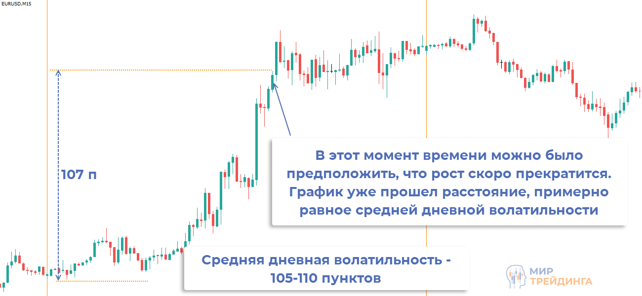 Еще один вариант использования этой информации – оценка расстояния, пройденного ценой за день. Если известно, что средняя дневная волатильность равна, например, 80 пунктам, и цена уже прошла 65-75 пунктов в одном направлении, то растет вероятность отката. Эту закономерность можно использовать для фиксации профита или торговли на откатах.
