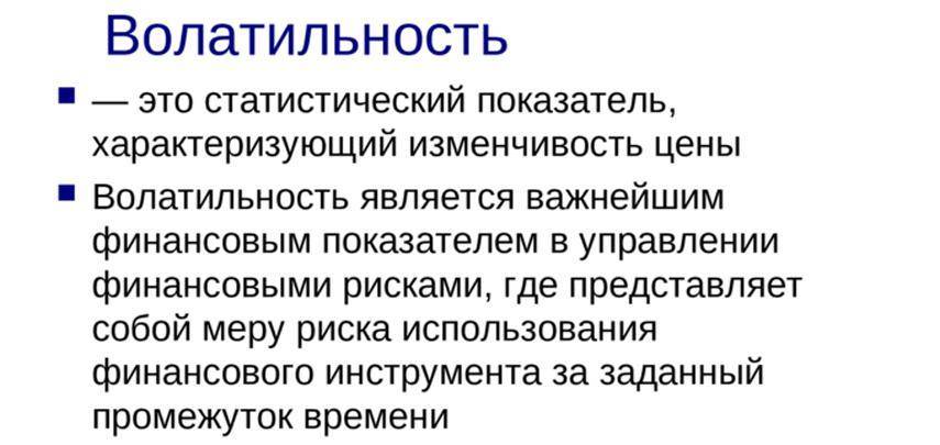 Волатильность — важный инструмент для управления финансовыми рисками. Представляет собой определенное значение за конкретный период времени, то есть можно измерить количественно. Чаще всего, для подсчета волатильности используют годовые периоды, чтобы значения были точнее.