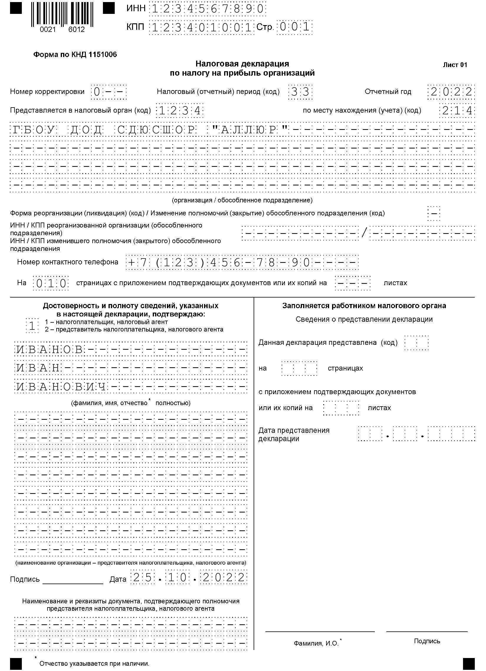 На листе производится расчет налога (авансового платежа) за налоговый или отчетный период. По общему правилу его включают в декларацию все налогоплательщики. Этого листа не будет в декларации по обособленному подразделению, а также в декларации лица, которое не является налогоплательщиком, если декларация является налоговым расчетом, который представляется налоговым агентом, или если в декларации отражена только прибыль контролируемой иностранной компании.