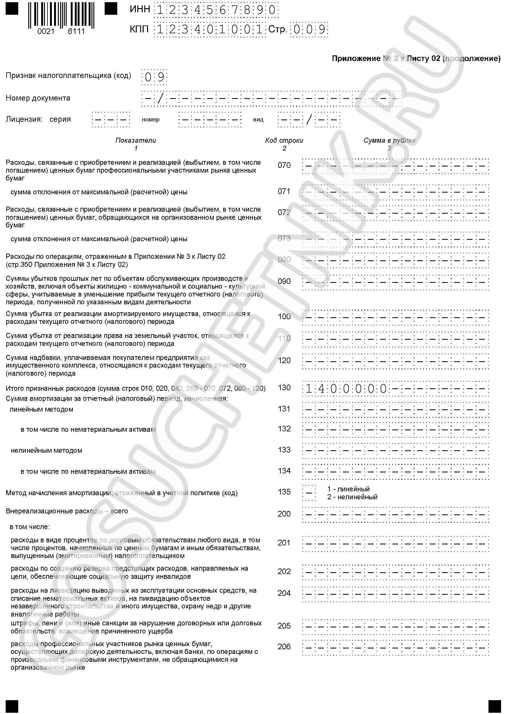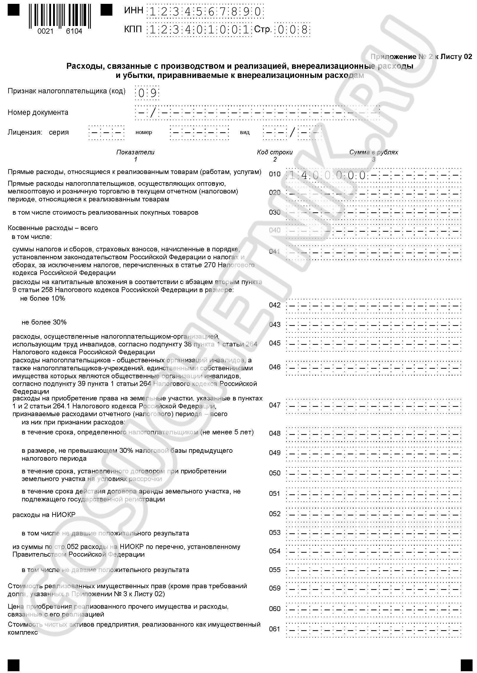 В этом приложении расшифровываются расходы налогоплательщика — расходы, связанные с производством и реализацией, внереализационные расходы, а также убытки, приравниваемые к внереализационным расходам. Все показатели нужно указывать без учета самостоятельных корректировок, произведенных по операциям со взаимозависимыми лицами и приведенных в листе . Рассмотрим порядок заполнения показателей этого приложения.