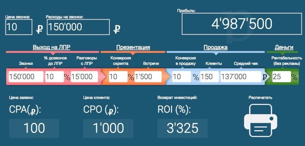 - Конверсия 10% – из холодного звонка в продажу (на каждом этапе);