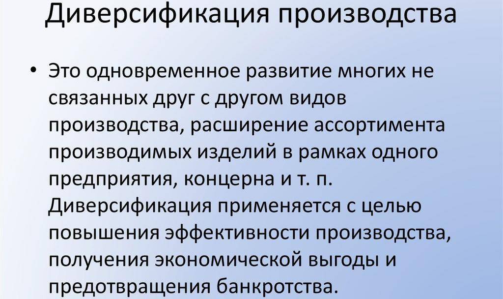 Диверсификация помогает бизнесу стать мобильным и устойчивым как к внешним, так и к внутренним угрозам, что делает субъект жизнеспособным в экономике. Простыми словами, диверсификация является противоположностью специализации. Диверсификация расширяет определённые аспекты производства: рынок сбыта, ассортимент продукции, активы и прочее. А специализация имеет узкое направление развития.