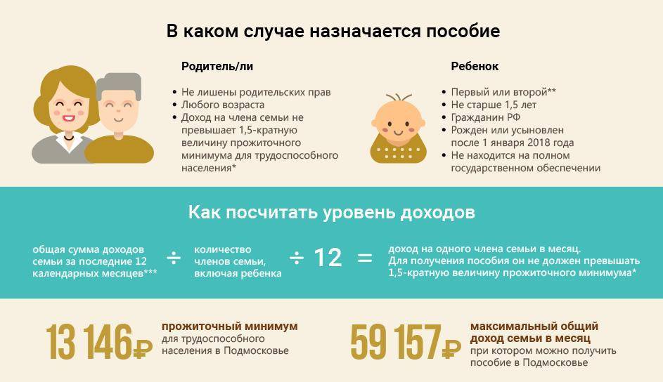 - Пособие до 16 (18) лет. Варьируется в зависимости от конкретного субъекта РФ, но обычно начинается с полутора лет.