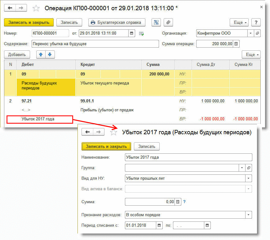Для учета и списания убытков прошлых лет в «1С:Бухгалтерии 8» используется счет 97.21 «Прочие расходы будущих периодов». На первом этапе налоговый убыток текущего года, учитываемый по дебету счета 99.01.1 «Прибыли и убытки по деятельности с основной системой налогообложения», следует перенести в дебет счета 97.21, указав в качестве аналитики (субконто) элемент справочника Расходы будущих периодов (рис. 2).