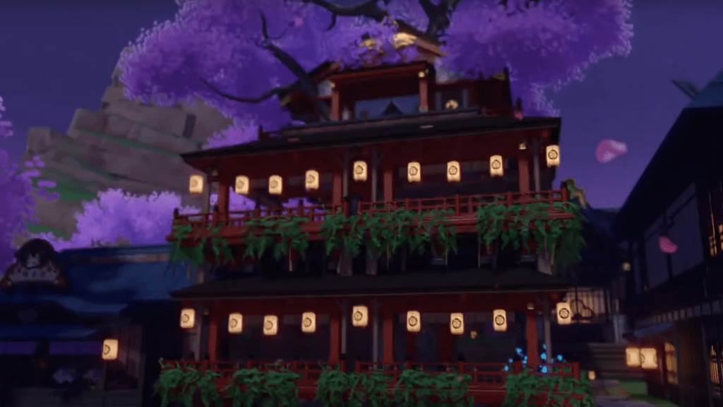 Двухэтажное здание построено вокруг вишневого дерева. В чайхане есть лестница, поэтому не нужно подниматься по стенам, чтобы попасть на второй этаж. Чтобы построить Чайный домик сакуры, вам понадобится более 130 предметов, поэтому на сбор всех материалов и чертежей может потребоваться время.