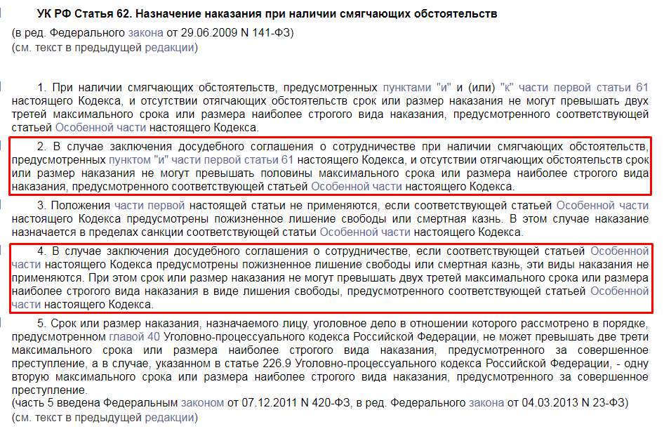 Как показывает практика, если суд устанавливает нарушения со стороны обвиняемого при заключении соглашения, то дело рассматривается в общем порядке и наказание назначается также по общепринятым правилам. Если соглашение заключено, то виновный может получить половину срока наказания, который предусматривается санкцией статьи закона.