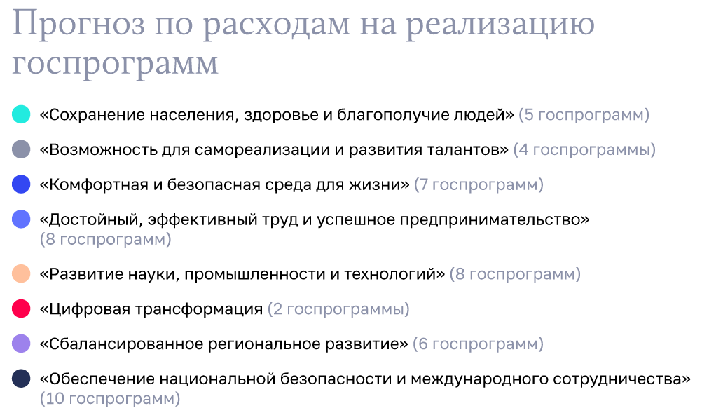 Однако расходы могут быть классифицированы по нескольким правилам – например, по главным распорядителям бюджетных средств (МВД, Минобороны, Минздрав и т.д.), или по государственным программам. Распорядителей в России почти 100, поэтому более нагляднее будет разделить расходы именно по программным целям.