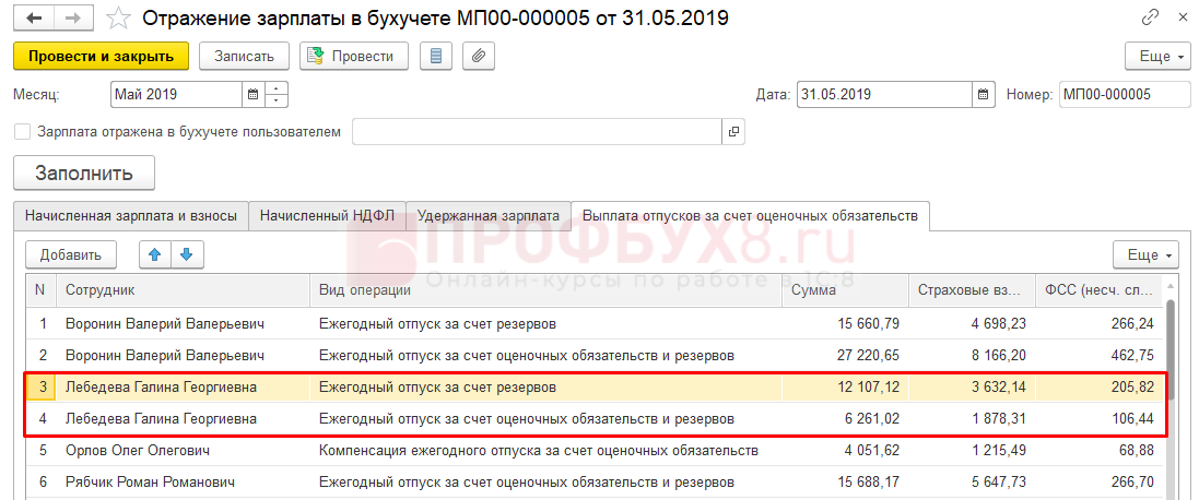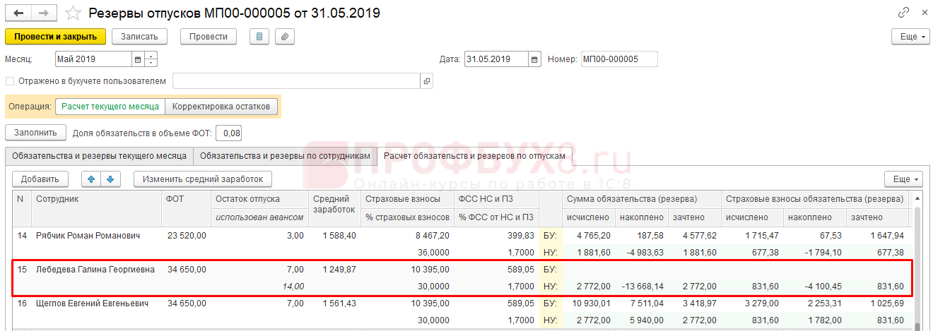 Проведем документом Резервы отпусков и посмотрим, как рассчиталась сумма для Лебедевой Л.Л.