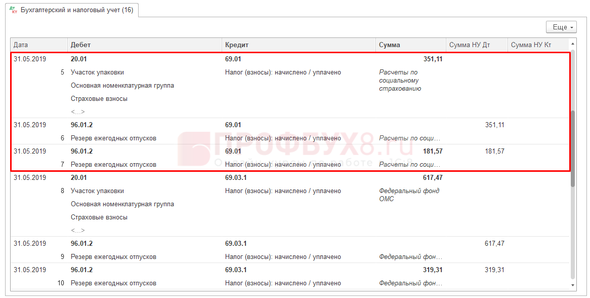 А также проводки по начисленным за счет резервов взносам. Для примера посмотрим проводки по взносам ФСС: