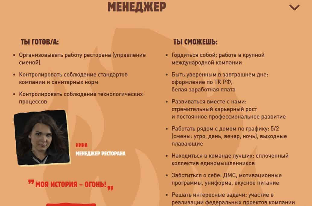 Следующая ступень – менеджер. Должностные обязанности – организация работы ресторана, контролирование соблюдения стандартов Burger King и технологических процессов.