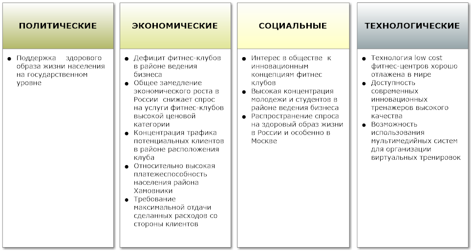 Для анализа внешней и внутренней среды в бизнес-плане фитнес-клуба используется SWOT-анализ. Оцениваются сильные и слабые стороны бизнеса, угрозы и возможности для развития.