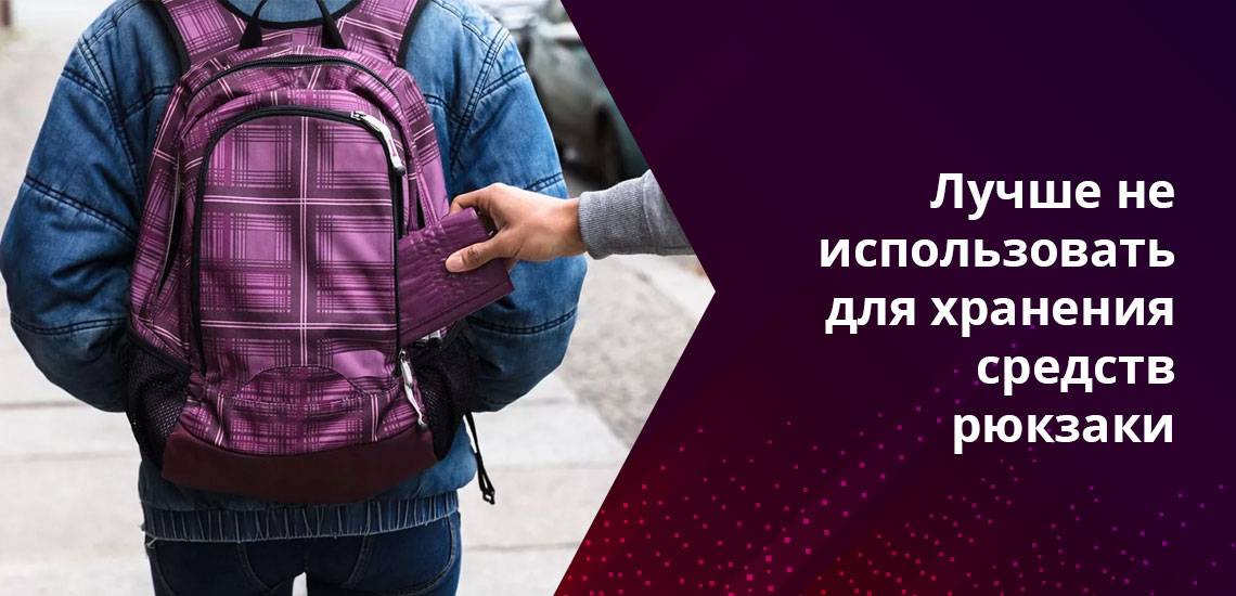 - лучше не использовать для хранения средств рюкзаки. Вне поля видимости владельца он может стать жертвой воров. Разрезать рюкзак сзади гораздо проще;