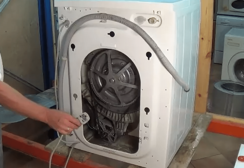 Второе место в стиральной машинке — блок самостоятельного слива. В нем размещен небольшой шланг. Все остальное пространство свободно. Туда можно спрятать скрученную пачку купюр.