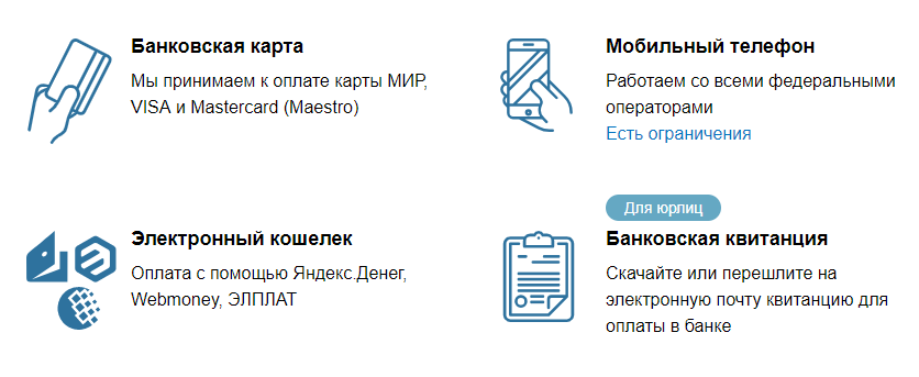 Уплата безналичным способом доступна при наличии банковской карты, электронного кошелька или подключения к онлайн-сервису банка.