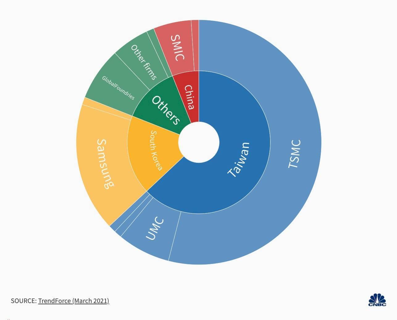 По данным аналитической фирмы TrendForce, в 2020 году более 60% выручки от всего мирового производства полупроводников, приходилось на тайваньские компании. При этом одна TSMC получала 54% от всей мировой выручки.