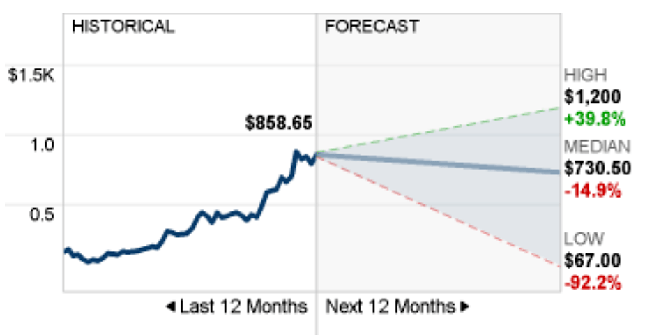 Остальные дают более оптимистичный прогноз и предполагают рост до 1010, 1030 и даже 1200 долларов за штуку. Поэтому прогнозируемая средневзвешенная цена — 730, что ниже текущих 860.