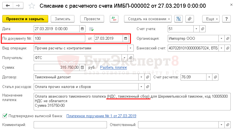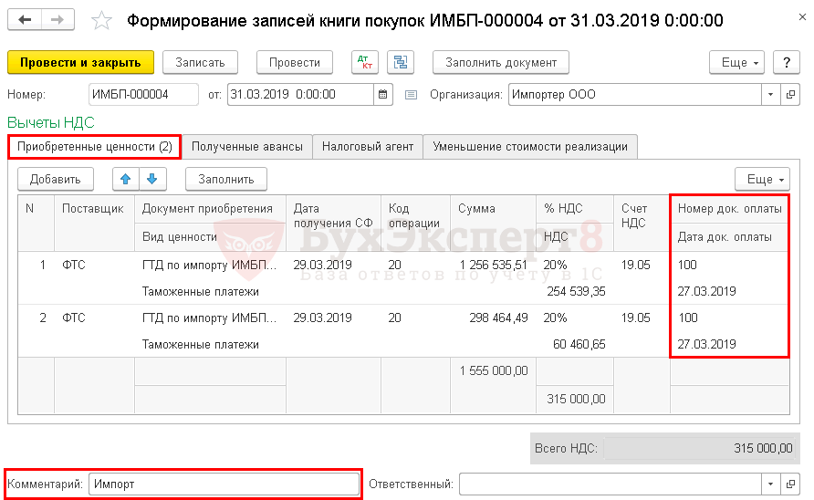 - Комментарий — БухЭксперт8 советует заполнить информацию о платежке на уплату НДС, зачтенного по таможенной декларации (графа 47 «Исчисление платежей», вид платежа 5010). Эти данные понадобятся при принятии НДС к вычету.