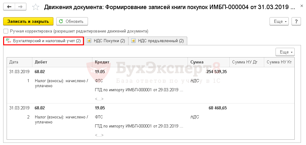 По кнопке Заполнить автоматически отразятся данные по начисленному НДС на таможне. Но для корректного заполнения книги покупок внесите корректировки.