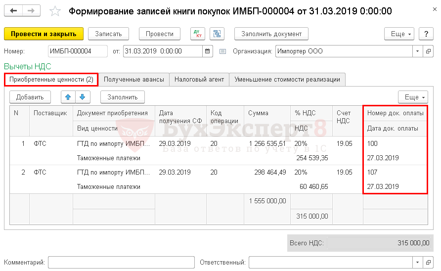 Флажок Отразить вычет НДС в книге покупок — не устанавливайте. Если он установлен, то все платежные документы, по которым произошел зачет аванса, отразятся в книге покупок: платежные поручения на уплату пошлин, сборов, НДС. А в нее должно попасть только то платежное поручение, которым оплачен НДС.