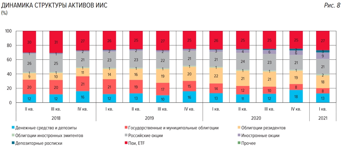 По данным Банка России, инвесторы с 2018 года по I квартал 2021 года распределяли средства на ИИС таким образом: