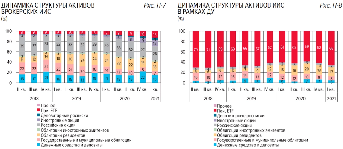 По данным Банка России, доверительные управляющие больше вкладывают в паи и ETF, а самостоятельные инвесторы покупают на ИИС акции российских и зарубежных компаний.