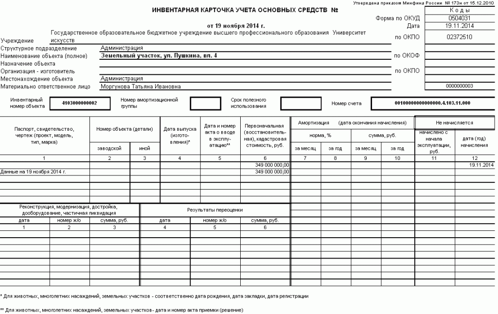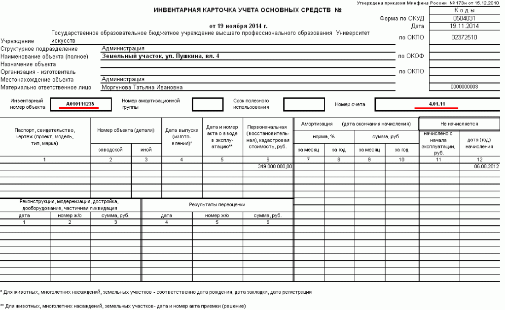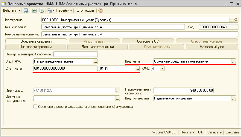 При учете земельного участка за балансом в карточке объекта был указан вид учета «Основные средства в пользовании» и счет 01.