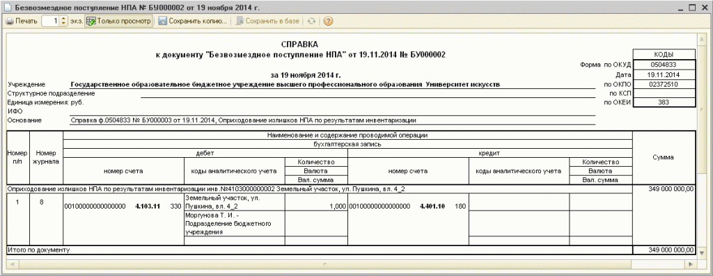 Принятие к учету земельных участков на счет 103.11 по результатам инвентаризации оформляется документом «Безвозмездное поступление НПА» (меню «ОС, НМА, НПА – Учет непроизведенных активов» главного меню программы, интерфейс «Полный») с хозяйственной операцией «Оприходование излишков НПА по результатам инвентаризации».