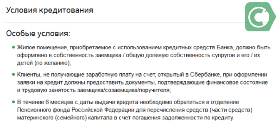 - Сбербанк — для возможности погасить кредит с применением средств сертификата нужно оформить квартиру в собственность. Первый взнос можно подтвердить средствами капитала.