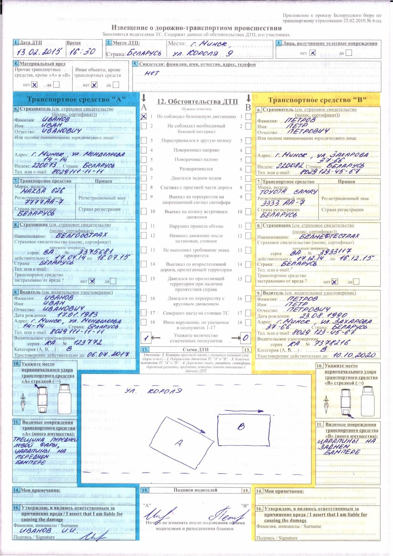 Ниже представлен образец заполненного бланка «Европротокола».